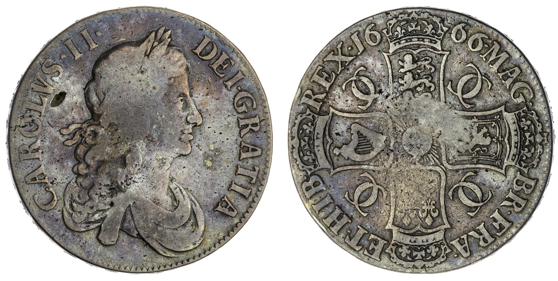 Charles II (1660-1685), Crown, 1666 XVIII, second laureate bust right, crooked ties, rev. crowned cruciform shields, interlinked C's in angles, six strings to harp, edge lettered upwards, 29.52g, 6h (ESC 32; Bull 366-[S]; Spink 3355), lightly haymarked and with a pitted mark below V of CAROLVS, nevertheless toned, strictly fine but the Historic Year of the Great Fire of London and traditional founding date of Spink