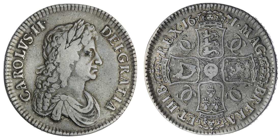 Charles II (1660-1685), Crown, 1671 VICESIMO TERTIO, third laureate and draped bust right, rev. crowned shields cruciform, seven strings to harp, edge lettered edge downwards, 29.69g, 6h (ESC 43; Bull 386; Spink 3358), rubbed on hair on a broad-struck and neat flan, lightly cabinet toned, almost very fine, quite stylish for issue