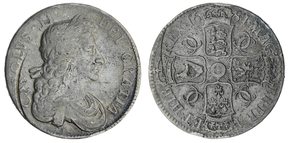 Charles II (1660-1685), Crown, 1681 TRICESIMO TERTIO, fourth laureate and draped bust right, rev. crowned shields cruciform, eight strings to harp, edge lettered downwards, 29.24g, 6h (ESC 64; Bull 414; Spink 3359), an overt 'cookie-cutter' striking flaw behind bust, otherwise contact marked and flecked and somewhat bright, otherwise a bolder fine / almost very fine, an unusual flaw on so large a 17th Century denomination