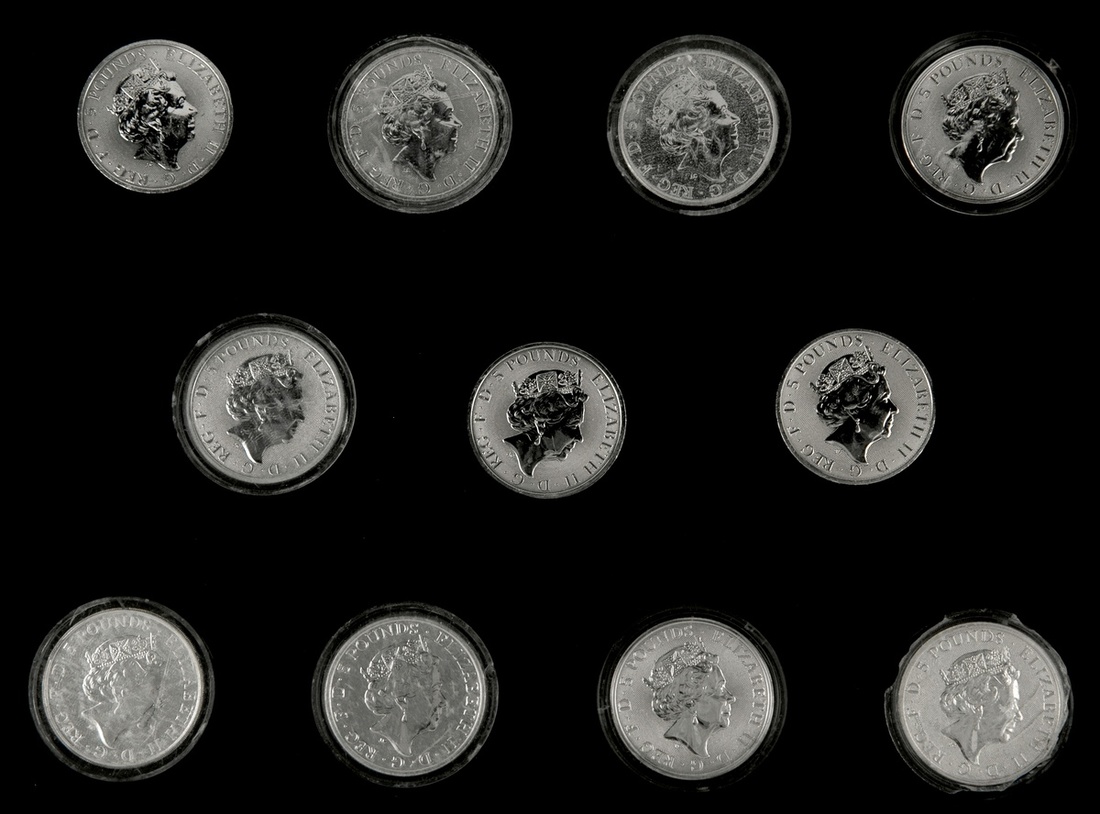 Great Britain. Elizabeth II (1952-2022). "Queen's Beasts" Set of 5 Pound - 2 OZ Fine Silver Coins, 2016-2021. Includes: 2016, 2017 (two types), 2018 (two types), 2019 (two types), 2020 (two types) and 2021 (two types). Portrait of her late majesty Queen Elizabeth II, rev. Arms with various "beasts" - lion, Red Dragon of Wales, griffin, etc. In original case. Choice-Gem BU. (Set of 11 coins)