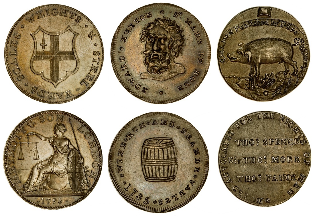 Great Britain. Middlesex. Trio of better 18th Century Merchant Halfpenny Tokens: Meymott's. 1795. Britannia/London Arms. D& H 378. Some hairlines. Unc.; Neeton's. 1795. Saracen head/barrel. D&H 390. EF; and Spence's. Pig trampling emblems of royalty/Spence-More-Paine legend. D&H 842b. AU. (3)