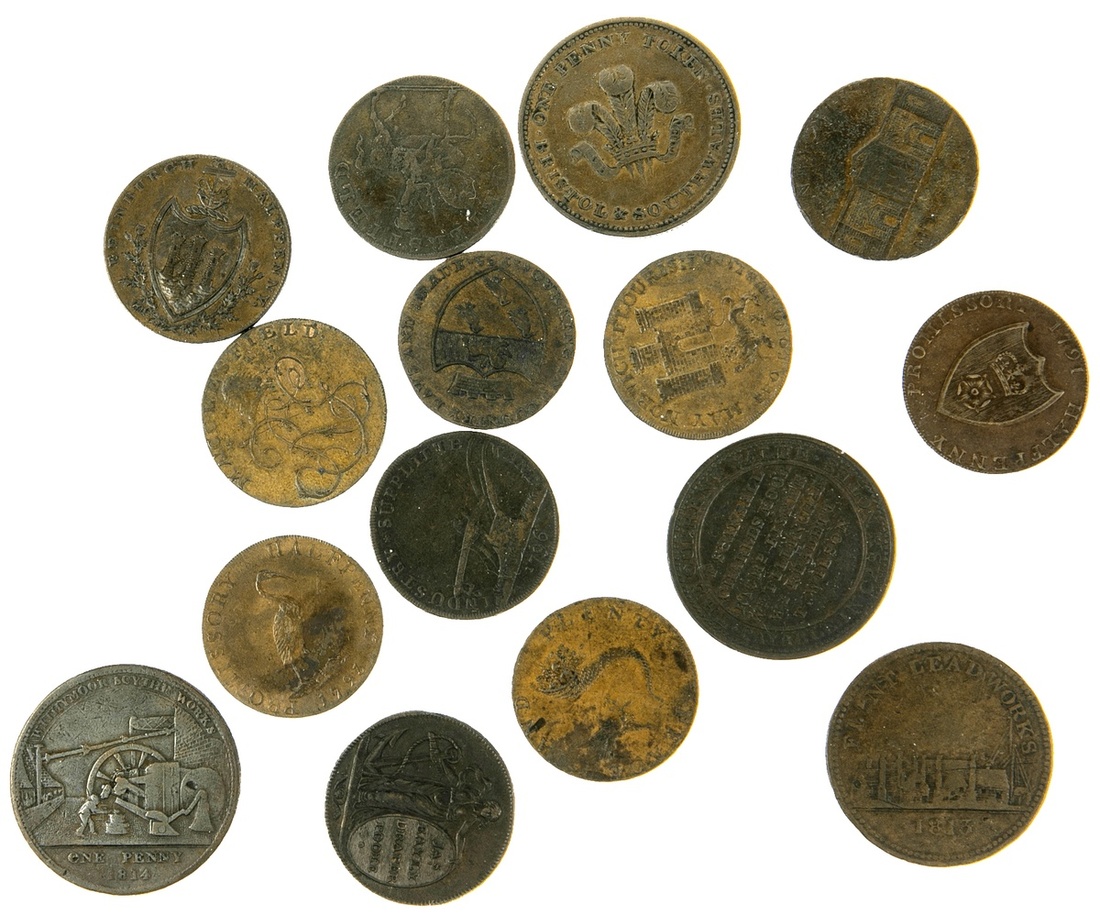 Great Britain. Lot of 18th and early 19th Century Merchant Tokens. 18th Century. All Halfpennies: Cheshire. Macclesfield. 1791. Mule - Woman seated left/plow; 1792. Cipher/Woman seated left; Dorsetshire. Poole. 1795. Hope/Arms; Hampshire. Emsworth. 1794. Seated woman/Dove, etc, Petersfield. 1793. Man on horseback/Stork (2); Portsmouth. 1791. Sir Bevois/ Arms. About Uncirculated; Kent. Canterbury. 1795. Cathedral/Arms; Middlesex. Newgate. Scratches and flan flaws; Norfolk. Norwich. 1792. Turreted gate with lion; Scotland. Lothian. Edinburgh. 1790. St. Andrew/Arms; 19th Century. All Pennies: 1811 - Bristol & South Wales, Newark - Stansall; 1813 - Flint Lead Works; and 1814 - Withymoor Scythe Works. The Pennies with some surface marks. All once stored in PVC-containing holders. Generally VF-EF. (15)
