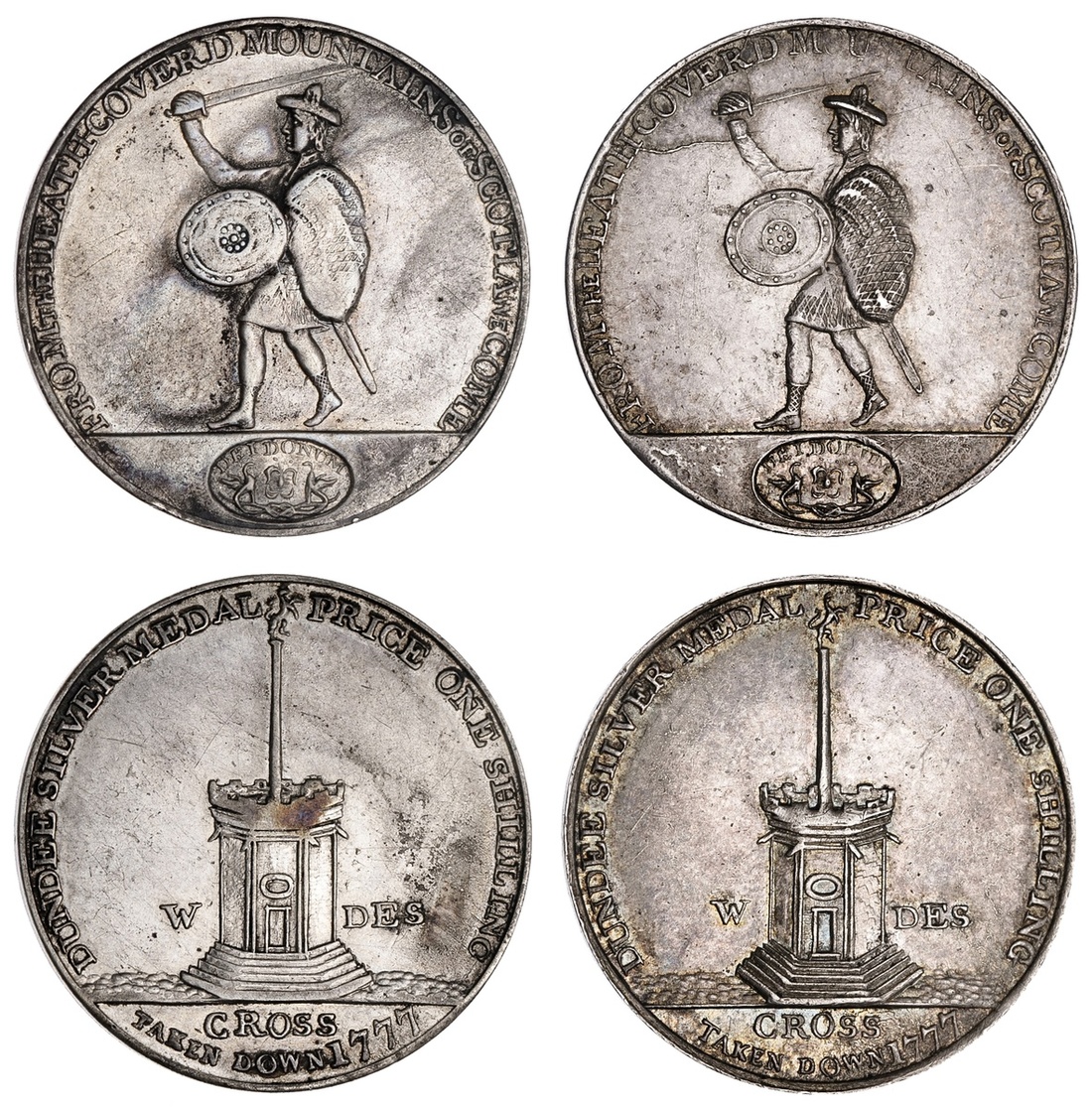 Scotland. Angusshire. Dundee. J. Wright. Pair of AR Shilling Tokens, 1797. Ancient cross, rev. Highlander brandishing sword left. D&H 3, 4. Very rare and Rare. The first EF, the later hairlines VF. Ex Prof. Nigel Trewin Collection. (2)