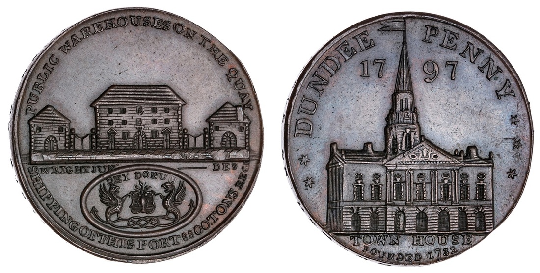 Scotland. Angusshire. Dundee. Penny Token, 1797. Public warehouse building, Arms in oval below, rev.Town House. D&H 5. Uncirculated. Ex Prof. Nigel Trewin Collection.