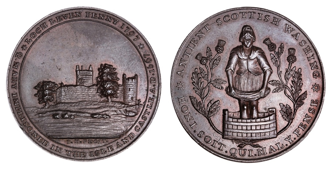 Scotland. Kinrosshire. Loch Leven. Penny Token, 1797. Castle; Q. MARY IMPRISONED IN THE ISLE AND CASTLE. A.D. 1567, rev. Girl facing, treading linen in a tub; ANCIENT SCOTTISH WASHING. D&H 1. Rare. Uncirculated. Ex Prof. Nigel Trewin Collection.