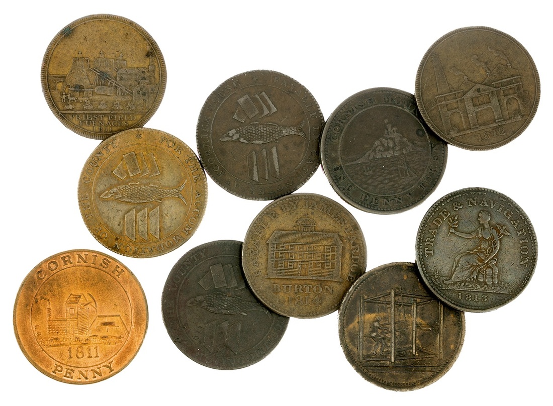 Great Britain. Lot of early 19th Century Penny Tokens: Cornwall. 1811-- For the Accommodation of the County (2), and Payable at Scorrier House; nd. Cornish Mount/ West Wheal Fortune; Barnsley. nd. Jackson & Listers; Bilston. 1811, Priestfield Furnaces; Burton 1814. James Pardoe; Hull. 1812. Lead Works; Trade & Navigation, 1813 overstruck on a Bristol Penny. VF-EF; also modern copy of a Cornish Penny (CCC below). Ex Prof. Nigel Trewin Collection. (10)