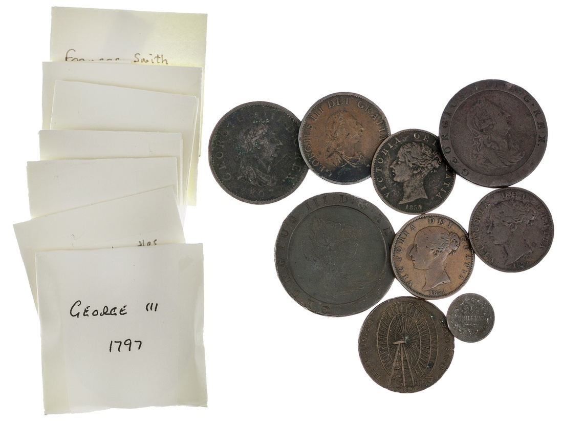 Great Britain. Lot of AE Tokens and Coins: 17th Century tokens -- King's Sutton. Edmund, Chandler. Halfpenny, 1666. Rare. Surface deposits; Oxford. Edmund Wrigglesworth, 1652. Surface corrosion; Bury St. Edmunds. Frances Smith. Farthing, 1666. Edge cut; Bristol. Farthing, 1652; other tokens -- City of London Brewery, 1869 (scratches); Earl's Court Gigantic Wheel 1901; 2 ½ Shilling spielmunze, Hans Krauwinckel brass Jeton - lion of St. Mark; "Cartwheel" Twopence, 1797 (2). Contact marks, About VF; Penny, 1797; Halfpennies: 1799 (surface digs), 1807 (porous), 1841, 1853 (scratches), 1854, 1855. VG-VF. Ex Prof. Nigel Trewin Collection. (17)