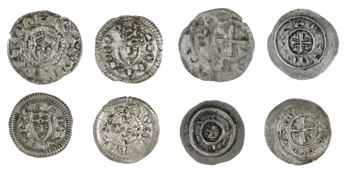 Hungary. Small group of late 11th-early 12th Century AR Denar. László (Ladislaus) I (1077-1095). 0.42 gm. Facing head; +LADISCLAVS RE (retrograde S's); Kalman (Koloman) (1095-1116). 0.38 gm. Elaborate cross, with double cross ends; +CALMAN RE (the N retrograde), rev. Cross, wedges in angles; +LADISCLAVS RE (the S's retrograde). Rare; 0.47 gm. Facing head; +CALMAN RE (Retrograde N); and Béla II (1131-1141). 0.37 gm. Facing triangular head; REX BELA. Huszár 23, 31var., 32, 51. Good VF-EF. (4)