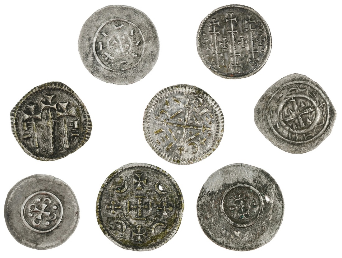 Hungary. Quartet of AR Denar. Stephan (István) II 1116-1131). 0.42 gm. Three tall crosses, TE-TE; Géza II 1141-1162). 0.24 gm. Cross, diamond formed in angles; G-EI-CA-RE; and Anonymous 12th Century Anepigraphic types: 0.25 gm. Cross flanked by small crosses, crescent in angles/Two small crosses with two pellets in central circle. Tiny rent at one of the crescents (likely from strike); 0.18 gm. Three tall Patriarchal crosses in field of small crosses/Cross with loops at ends, pellets in angles, all within central circle. Huszár 47, 55, 164, 179. Extremely Fine. (4)