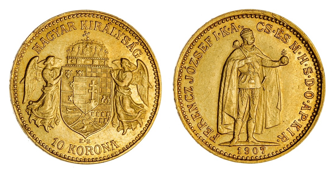 Hungary. Franz Josef (1848-1916). 10 Korona, 1907 KB. Körmöczbánya (Kremnitz). The emperor in regalia standing right, holding scepter and orb. KM 485. Obverse hairlines. Extremely Fine.