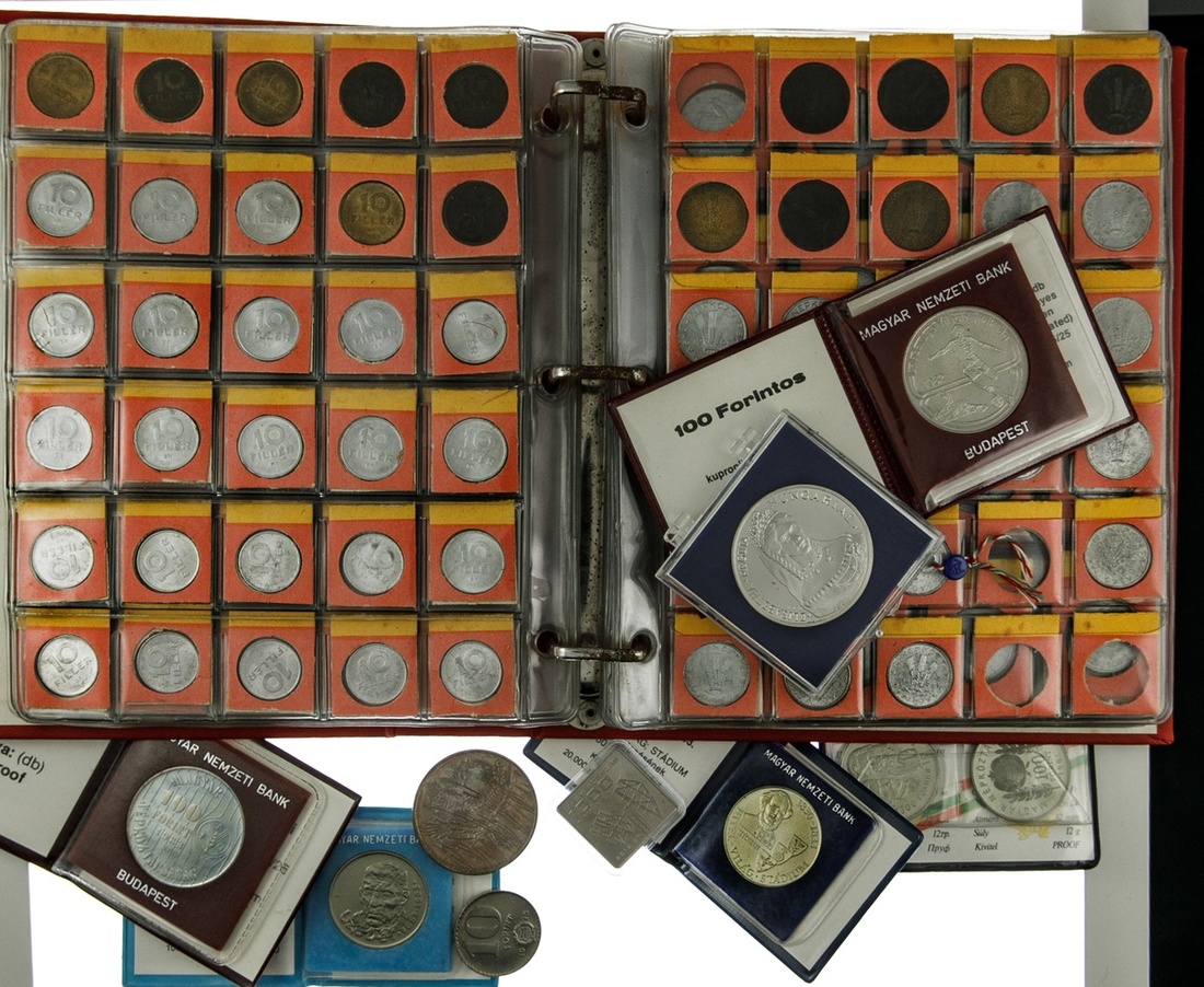 Hungary. Album of 1946-1970s coinage (165). 2 Fillér to 5 Forint with a majority of dates, if not all, for many types. Includes very scarce 50 Fillér 1948 KM 536 About EF: Forint 1946-1949 KM 532 complete, 1949-1952 km 545 complete, 1957-1966 KM 555 complete; 2 Forint 1946, 1947 KM 533 complete, 1950-1952 KM 548 complete, 1957-1962 KM 556 complete; 5 Forint, 1946, 1947 (both tarnished), also 5 Pengo, 1945, and some 10 Forints. VF-BU; additionally: 500 Forint, 1988 World Wildlife Fund; 100 Forint, 1981 Bulgarian Statehood accompanied by Bulgarian 5 Leva for same event; 1982 World Cup, 1983 -- FAO, Count Szechenyl, Béla Czobel; 1984 Sándor Kórósicsoma, 1000 Forint 2012; crown-sized silver medal for 150th Anniversary of the Birth of Queen Elisabeth. Uncirculated-Brilliant Proof.