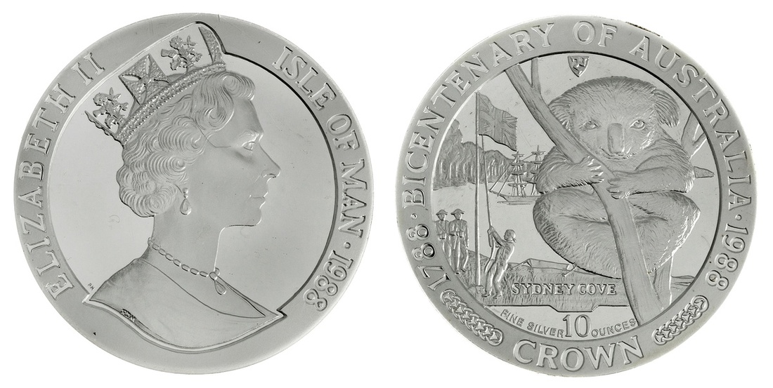 Isle of Man. Elizabeth II (1952-2022). 10 Crowns, 1988. 10 Ounces Fine Silver. Australian Bicentennial. Her late majesty's bust right, rev. Koala and the raising of the Union Jack at Sydney Cove. KM 258. 13,000 pieces struck. Choice Brilliant Proof.