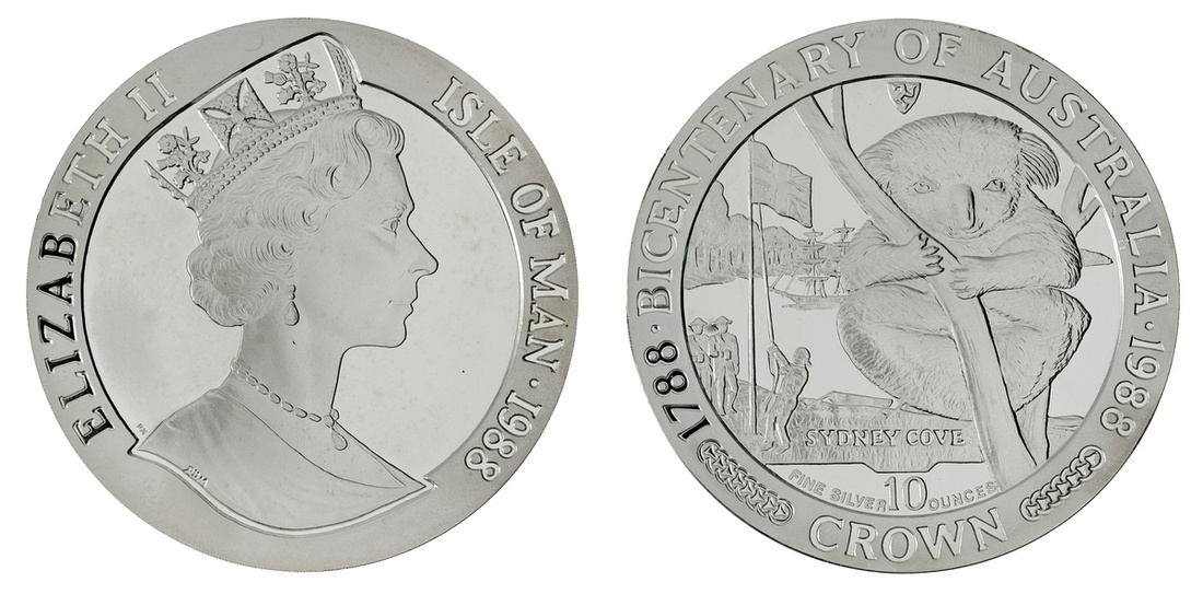 Isle of Man. Elizabeth II (1952-2022). 10 Crowns, 1988. 10 Ounces Fine Silver. Australian Bicentennial. Her late majesty's bust right, rev. Koala and the raising of the Union Jack at Sydney Cove. KM 258. 13,000 pieces struck. Choice Brilliant Proof.