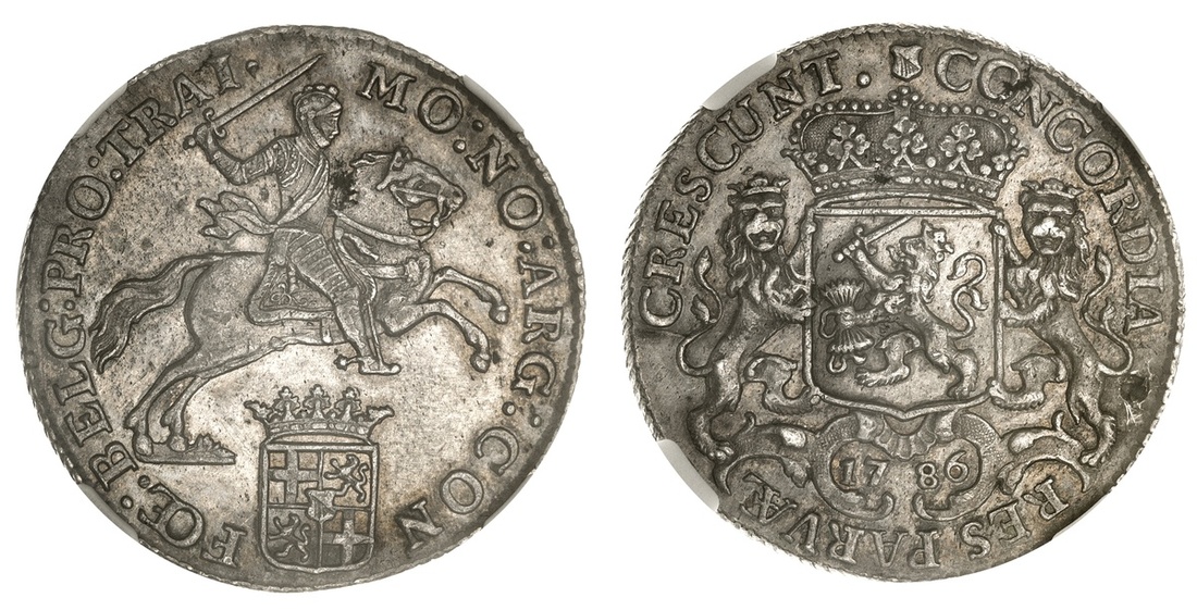 Netherlands. Utrecht. Half Ducaton, 1786. Knight on horseback charging right above small crowned Arms, rev. Crowned and supported Arms. KM 115.1. NGC AU Details, rev damage. Deep punch/dig at reverse far right.