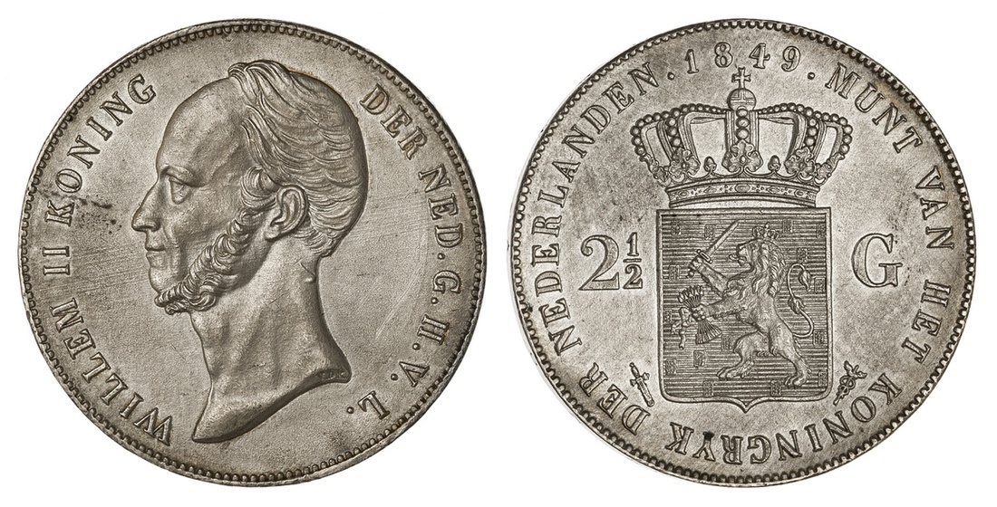 Netherlands. Willem II (1840-1849). 2 ½ Gulden, 1849. Bare head left, rev. Crowned Arms divides value. KM 69. Lightly salved. Uncirculated.