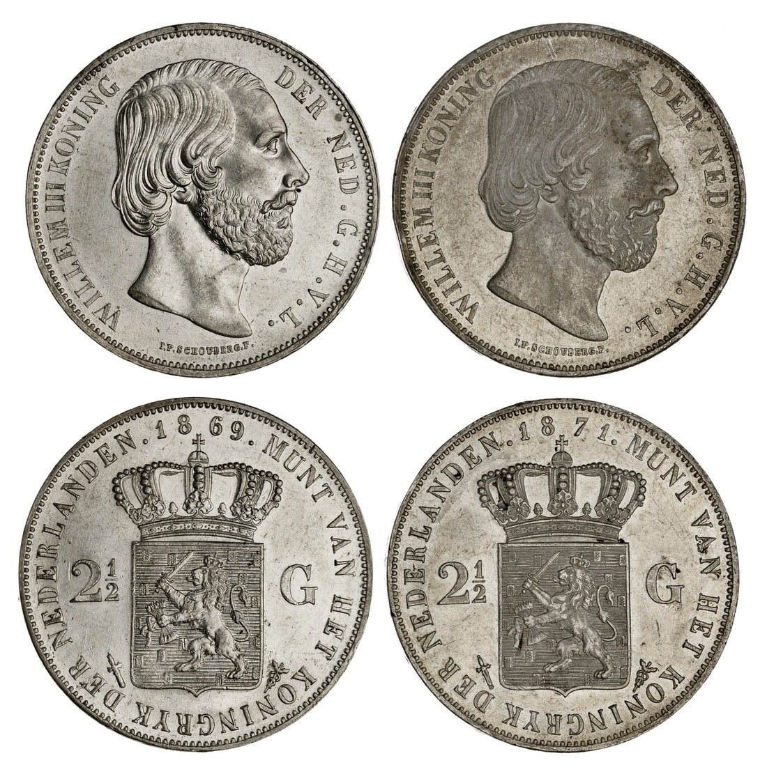 Netherlands. Willem III (1849-1890). Pair of 2 ½ Gulden, 1869 and 1871. Bare head right, rev. Crowned Arms divides value. KM 82. The first Uncirculated and lustrous, the latter with a small rim tap, AU. (2)
