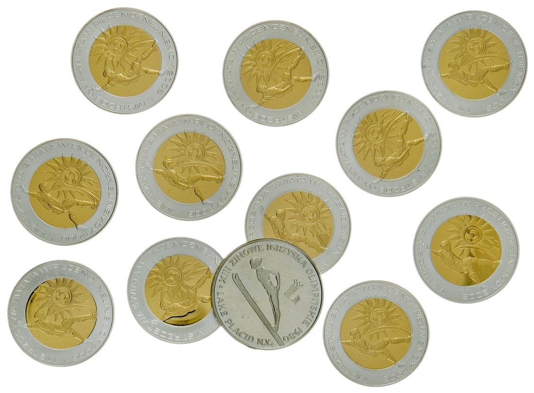 Poland. Third Republic. Lot of 10 Zlotych, 2006 (11). Warszawa. FIFA World Cup, 2006. Player kicking ball which becomes the sun. Y.754. Choice Brilliant Uncirculated; also Proof 200 Zlotych, 1980. Lake Placid Winter Olympics. Y.110a. Brilliant Proof. (12)