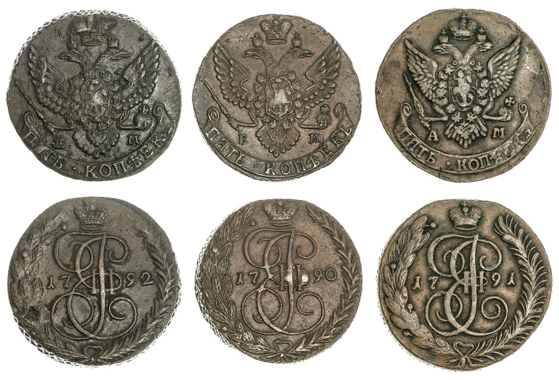 Russia. Catherine II (1762-1796). Trio of AE 5 Kopeks: 1790, 1792 EM. Extremely Fine; and 1791 AM. VF. C.59.3, 59.2. (3)