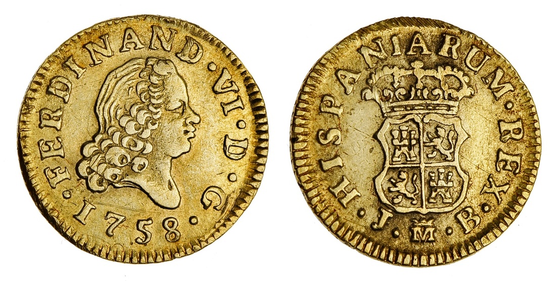Spain. Fernando VI (1746-1759). Half Escudo, 1758 JB. Madrid. Head right, rev. Crowned Arms. KM 378. About Extremely Fine.