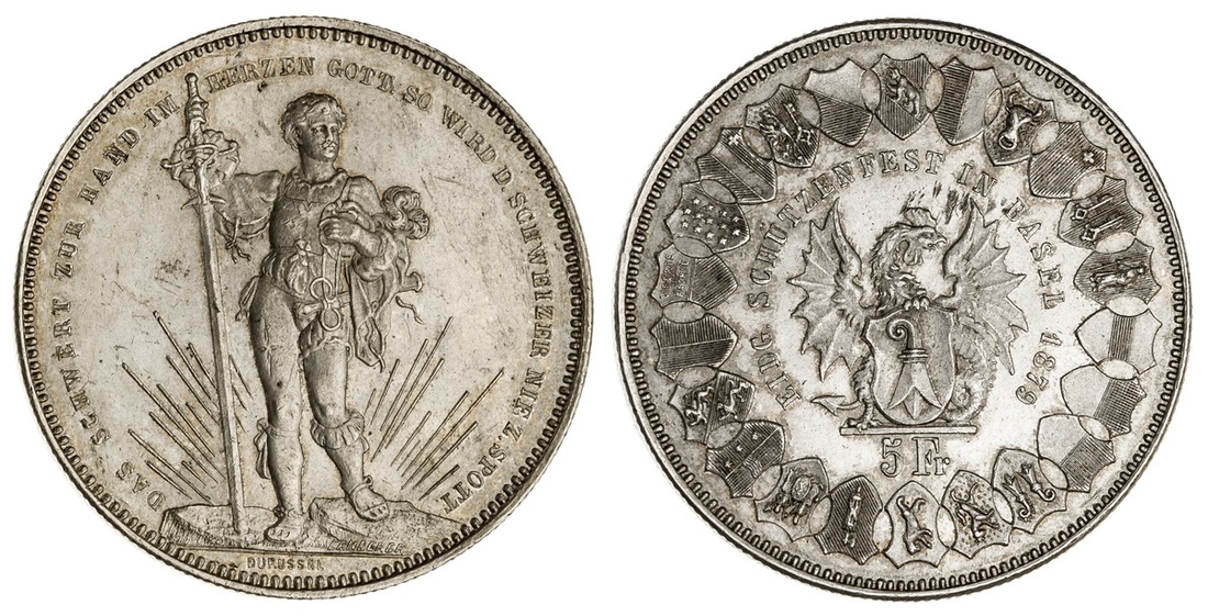 Switzerland. Confederation. 5 Francs. Shooting Festival, Basel 1879. Soldier standing holding longsword, rev. Basilisk at center holding Arms, Cantonal shields around. X #S14. Toned. Extremely Fine.