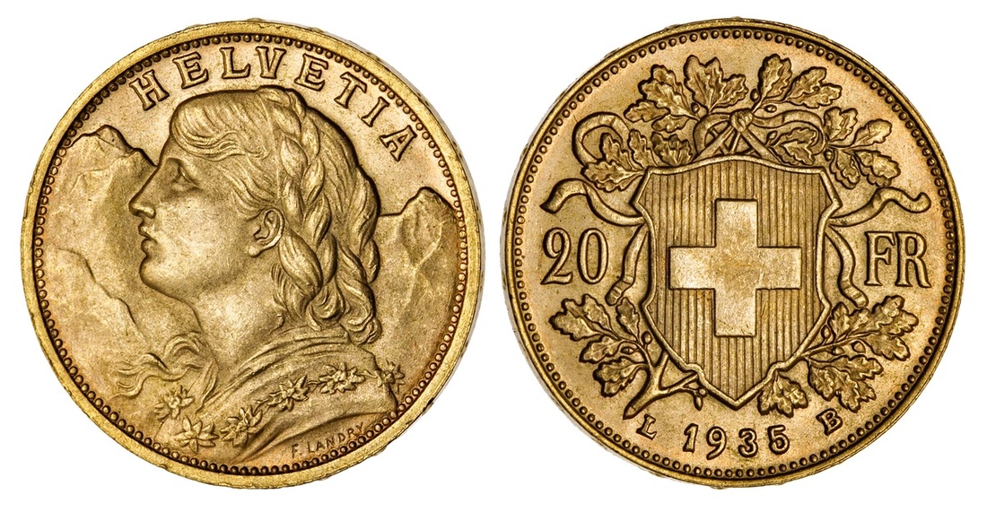 Switzerland. Confederation. 20 Francs, 1935 L-B. Vreneli type. KM 35.1. Brilliant Uncirculated.