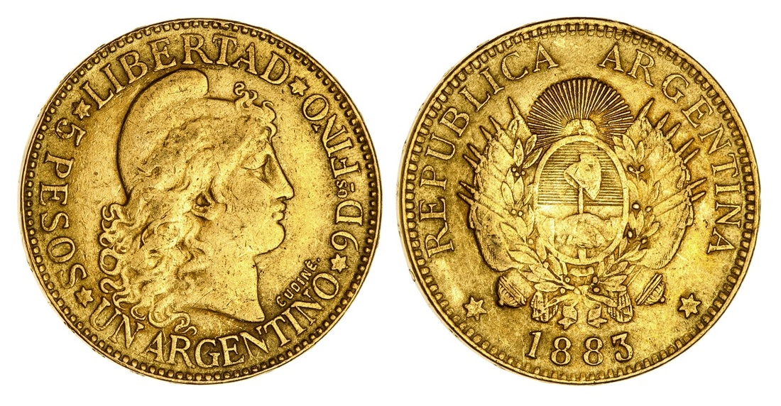 Argentina. Republica. Argentino, 1883. Capped Liberty head right. KM 31. Once wiped. About Very Fine.
