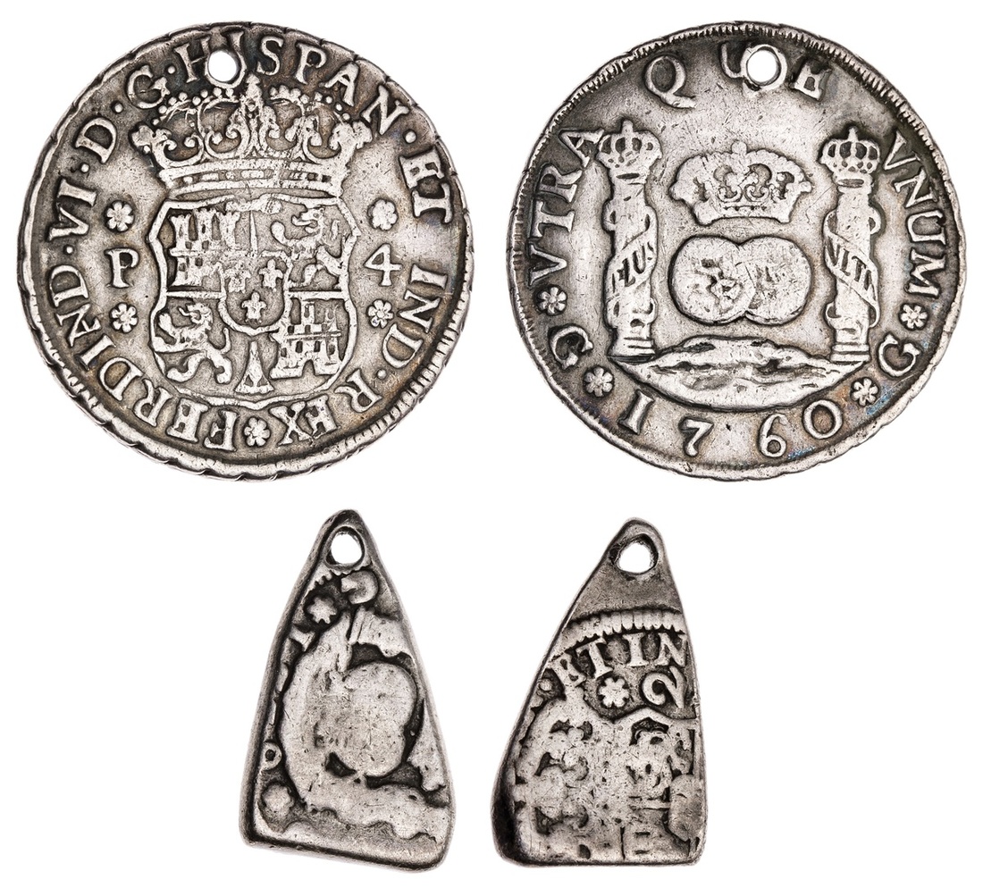 Guatemala. Fernando VI 1746-1759). 4 Reales, 1760 GJ. Dos Mundos types. KM 17.1. Holed at 12:30. VF details; also Cob 2 Reales, 17(39) G. Holed. About Fine. (2)