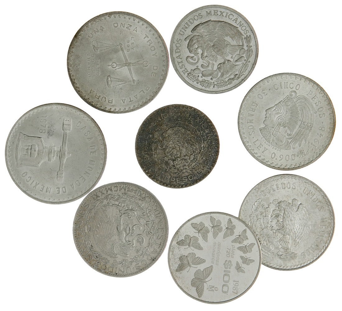 Mexico. Estados Unidos. Modern Crowns Lot: 2 Pesos, 1921. Centenario. KM 462. EF; 5 Pesos, 1948 (2). Cuauhtemoc. KM 465. Uncirculated; Proof 100 Pesos, 1987 - WWF. KM 537; Onzas, 1978, 1980; Mexico City Mint Battle of Puebla Centennial Medal, 1962. Silver. Uncirculated; also a 1962 Peso. (8)
