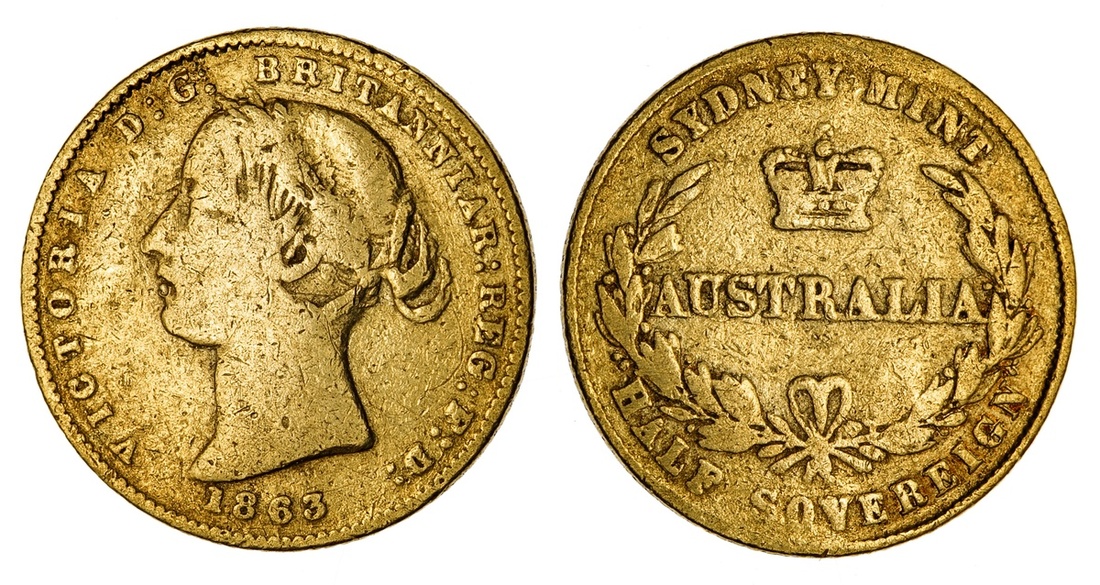 Australia. Victoria (1837-1901). Half Sovereign, 1863. Head left, hair tied with a banksia wreath, rev. AUSTRALIA, crown above, within wreath, mintname above. KM 3. Typical contact marks. About Fine.