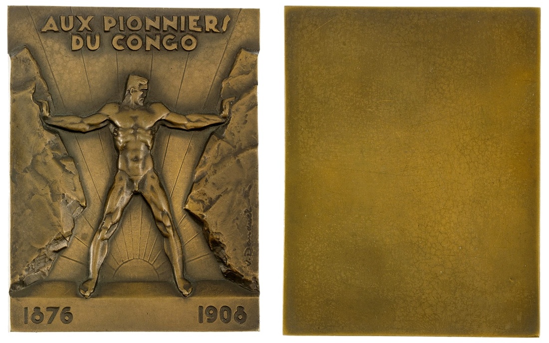 Belgian Congo. Aux Pionniers du Congo (1909). Bronze Plaque, 73 x 94mm. By Demanet. Nude male pushing out two massive boulders, radiant sun behind. Extremely Fine.