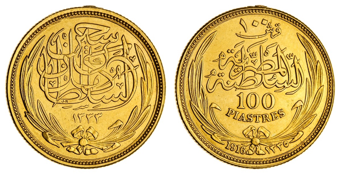 Egypt. British Protectorate. Hussein Kamil, as Sultan (AH 1333-1336/ 1914-1917 AD). 100 `Irsh, AH 1335- 1916. Ruler's protocol above hijra date, rev. al-sultanat al-misriya above value. KM 324. Some light hairlines. Extremely Fine.