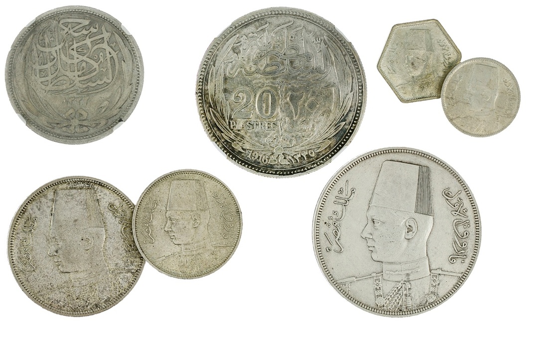 Egypt. Silver Lot. British Occupation. 20 `Irsh AH 1335- 1916. NGC XF Details - surface hairlines; 10 `irsh, AH 1335- 1916. NGC VF Details - surface hairlines; Farouk. 10 and 20 `irsh, AH 1358- 1939. The first About EF, the latter hairlines from cleaning. EF Details; 5 `Irsh, AH 1358- 1939, 2 `Irsh, AH 1361 - 1942 and AH 1363- 1944. EF. (7)
