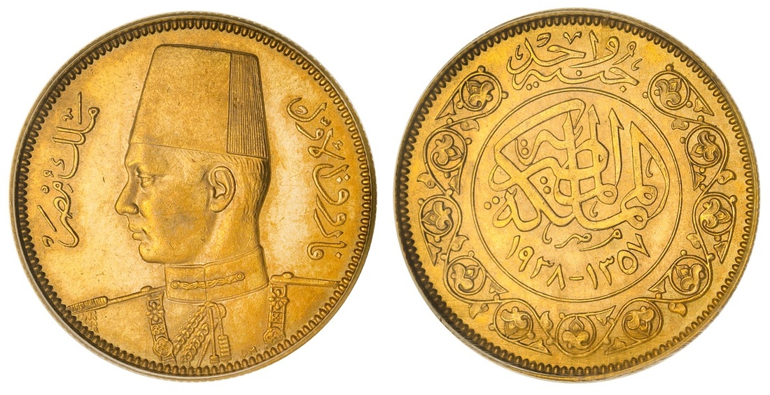 Egypt. Kingdom Malik Farouk (AH 1355-1372/ 1936-1952 AD). 100 `Irsh, AH 1357- 1938. On his Marriage to Queen Farida (Safinaz Zulficar). Uniformed bust left wearing tarboosh, rev. al-mamlaka al-misriya and dates within central circle, value "one gi'ney" above, ornate pattern around. KM 372. PCGS AU 58.