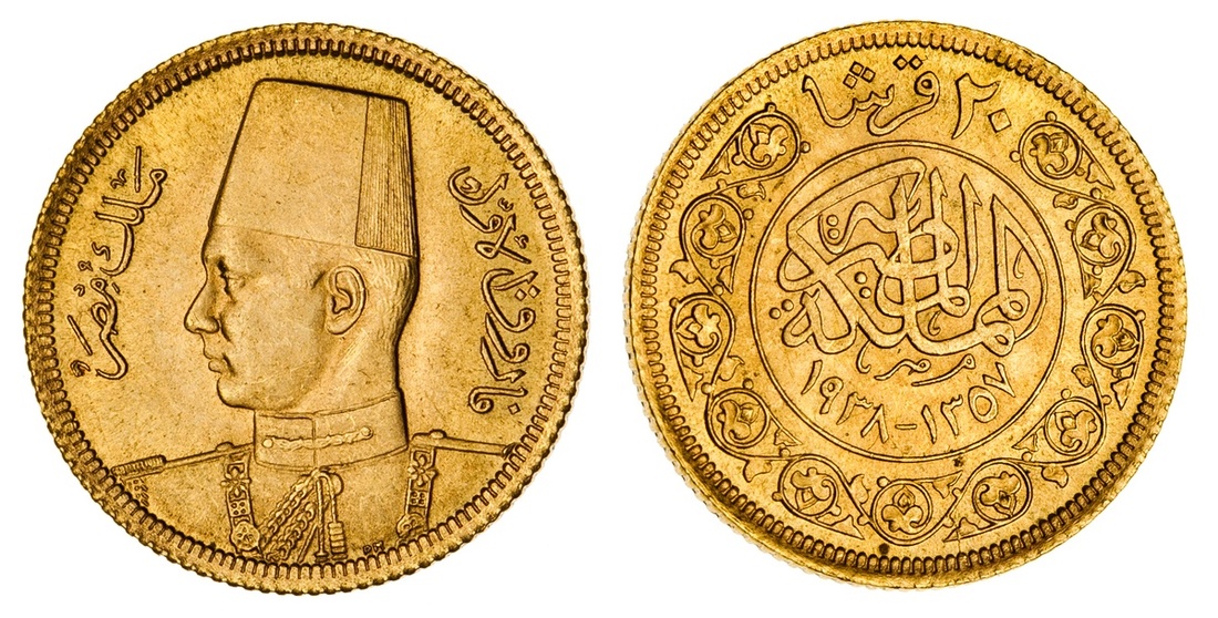 Egypt. Kingdom Malik Farouk (AH 1355-1372/ 1936-1952 AD). Gold 20 `Irsh, AH 1357- 1938. On his Marriage to Queen Farida (Safinaz Zulficar). Uniformed bust left wearing tarboosh, rev. al-mamlaka al-misriya and dates within central circle, value above, ornate pattern around. KM 370. Choice AU.