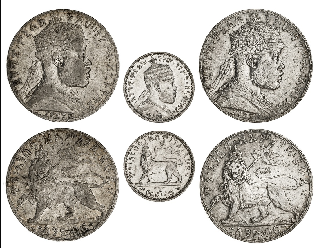 Ethiopia. Menelik II (1889-1913). ¼ Birr, EE 1889 A. About EF, once cleaned; Birr, EE 1895 (2). Both once cleaned, Fine and EF. Crowned bust right, rev. Lion of Judah left. (3)