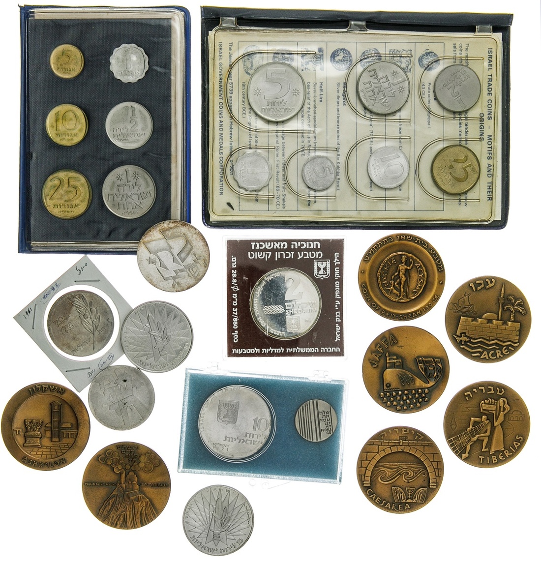 Israel. Lot of Silver Commemoratives and other. 5 Lirot, 1961 Independence Ark of the Law, 1966 Independence; 10 Lirot, 1967 (2) Victory, 1971 Let My People Go; 25 Lirot, 1976 Independence; Proof 2 Sheqalim 1985 Hanukkah. Brilliant Uncirculated; 2 Mint Sets; and Bronze States Medals - Acre, Ashkelon, Beit She'an, Caesarea, Jaffa, Jerusalem and Tiberias.