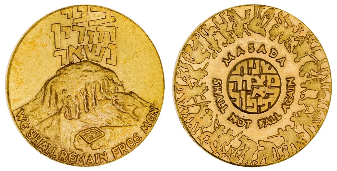 Israel. Masada. State Medal, 1965. Gold (916), 27mm. 14.86 gm. "Masada Shall Not Fall Again" inscribed on central shield, figures around excavating and restoring Masada, rev. Roman legion laying siege at base of mountain, above the precipice, part of Elazar Ben Yair's speech: "We Shall Remain Free Men" in Hebrew, repeated in English below. Numbered: 2706 on edge. Brilliant Uncirculated.