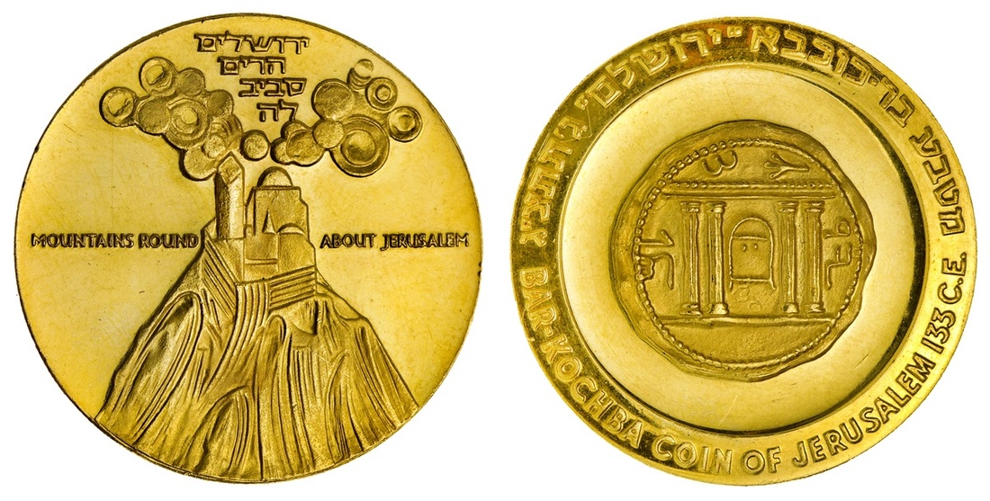 Israel. Jerusalem - Bar Kochba Coin. State Medal, 1966. Gold (.916), 35mm. 29.67 gm. By Jean David and Alex Berlyne. Mountains round about Jerusalem, rev. Bar Kochba Sela. Numbered: 0328 on edge. Some friction hairlines in field. Prooflike Brilliant Uncirculated.