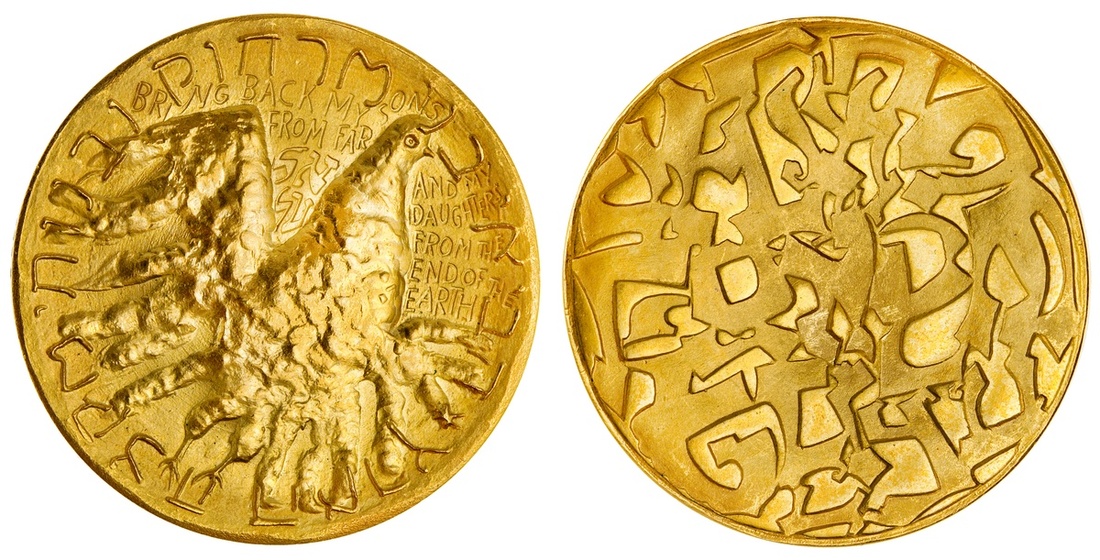 Israel. 20th Anniversary of El Al. State Medal, 1969. Gold (.916), 35mm. 30.03 gm. By Ben Shahn. Stylized dove; Isaiah 43:6 - "Bring back my sons from far and my daughters from the end of the earth", rev. The 22 letters of the Hebrew alphabet. Numbered: 505 on edge. 1,940 medals struck. Brilliant Uncirculated.