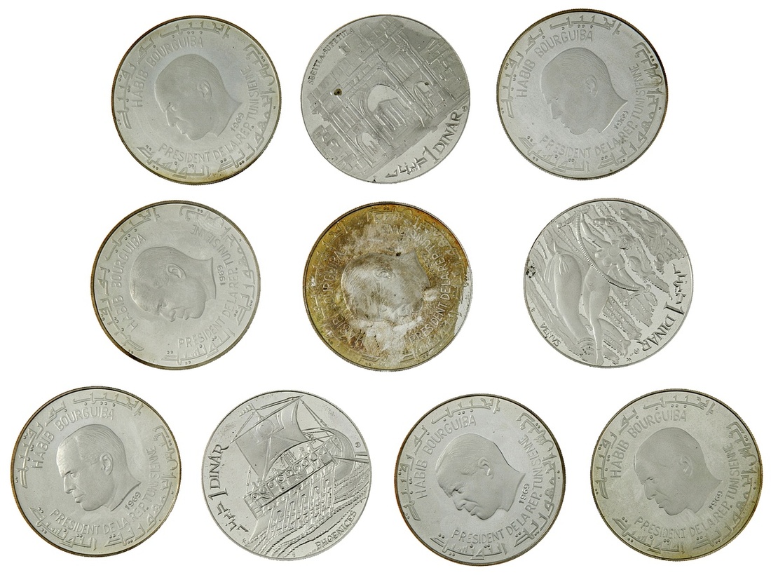 Tunisia. Republic. Near complete 1969 FM NI Scenes of Ancient Tunisia Dinar Proof Set. Missing only the Standing Neptune, KM 298. With extra Venus, KM 299. Brilliant Proof. (10)