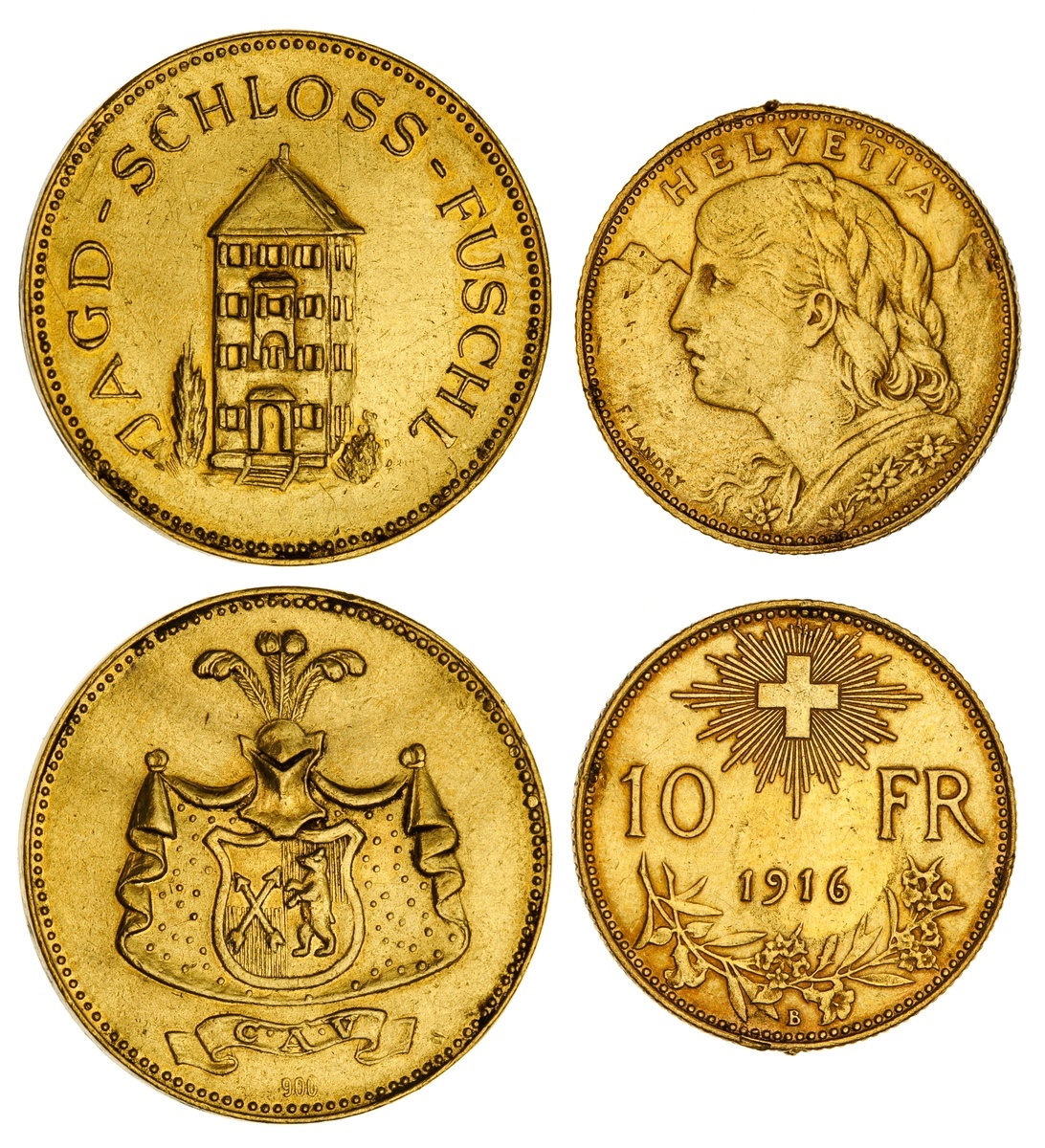 Pair of Gold issues: Switzerland. 10 Francs, 1916. Hairlines, small rim ding. Very Fine; and Austria. Schloss Fuschl. Medal. Gold (.900). ca. 7.5 gm. View of the castle tower in Hof bei Salzburg / Helmed and mantled Arms. Some contact marks. Extremely Fine. (2)
