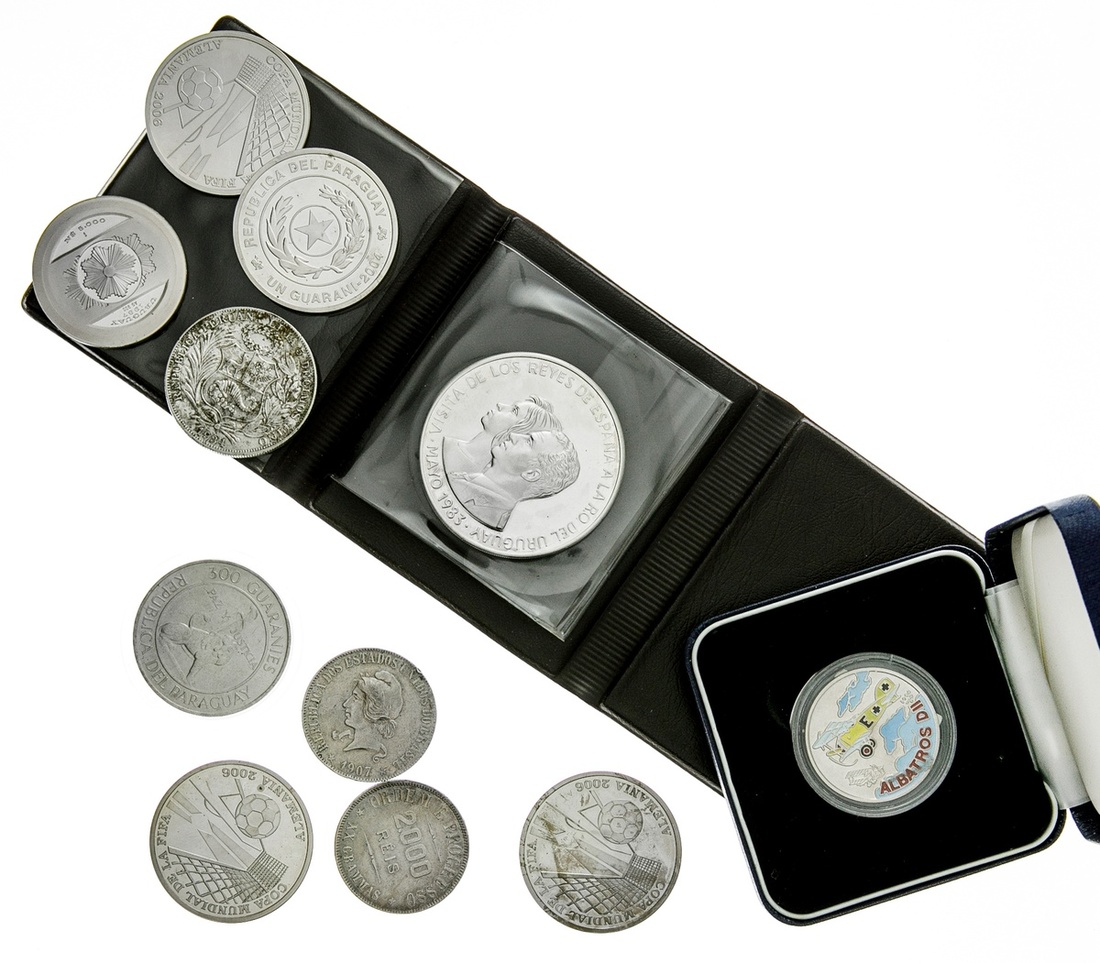 Latin American Silver Crowns. Paraguay. 300 Guarani, 1973 Stroessner. BU; Proof Guarani, 2004 - 2006 World Cup (4); Uruguay. Proof 2000 Nuevos Pesos, 1983 Visit of the King and Queen of Spain, Proof 5000 Nuevos Pesos 1987 Central Bank; Peru 1934 Sol, Brazil 2000 Reis, 1907 (2). VF; also Cuba 1994 colorized Peso - Albatross D II. Uncirculated. (11)