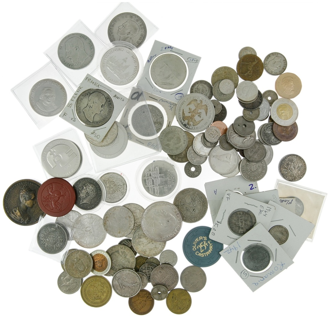 World Crowns and Minors. Silver Crowns: Austria 50 Schillings 1966 National Bank, Belgium 5 Francs 1870, Finland 10 Markkaa 1967, France 5 Francs An 12 Q (VG), Great Britain 1937 Crown, Spain 100 Pesetas 1966, Sweden 5 Kronor 1966, Crown-size silver Medals -- UN (4), Konrad Adenauer, Spanish 500th Anniversary Columbus (2); Silver halfcrowns from Denmark, Greece, British India (holed), New Zealand, and Sweden, also Swiss 1964 Lausanne medal; minors (100) - mostly 20th Century, but also a 1764 Saxon 1/12 Taler, a fair amount of silver, Canadian silver Proof singles, a Mussolini fantasy, an odd medal or two and a few old gaming chips. Generally Fine-Unc.