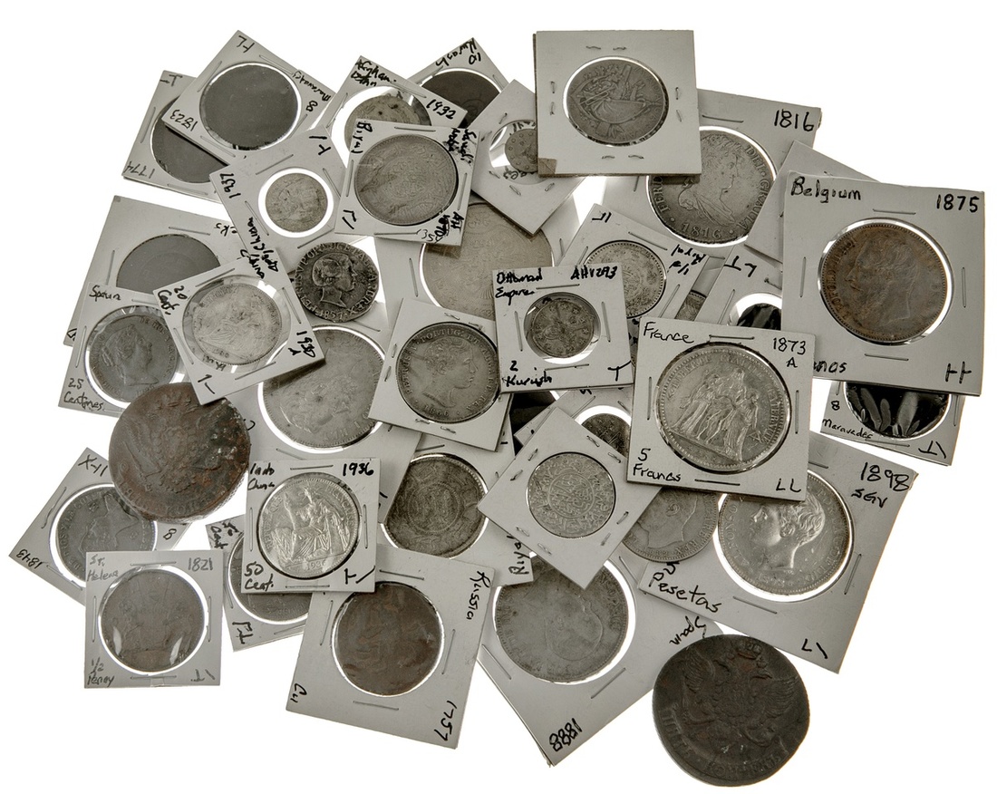 World Crowns and Minors. Silver: Belgium 5 Francs, 1875; Ceylon. 5 Rupees, 1957- Buddhism; France. 5 Francs, 1873 A; Portuguese India. Rupia, 1857 (porosity), 1882; Spain. 8 Reales, 1816 Madrid GJ, (pinscratches), 5 Pesetas, 1871, 1888 MP-M, 1898; Portugal. 500 Reis, 1856 (cleaned); Morocco. ¼ Riyal, AH 1321 London; Saudi Arabia. Riyals, AH 1354, 1370 (2), ½ Riyal, AH 1354; Silver minors from French Indo China (4), Ottoman Turkey (4), Afghanistan; AEs. Russia. 5 Kopeks, 1769 EM (spot of verdigris), 1791 KM, 2 Kopeks 1757, 1812; Siberia. Polushka, 1768. EF; Spain. 8 Maravedis, 1774 Segovia, 1817 J, 1823 J, 1843 Segovia, VF-EF; others (4); also France. Madagascar Campaign Medal, 1895. Silver. Fine-AU. (38)