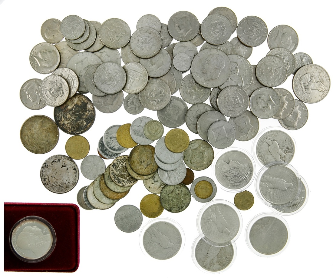Peace Dollars and sundries. Peace Dollars (10), 1922-1934. About VF-AU; a heavily toned 1986 Silver Eagle; Bush-Gorbachev Summit 1991 .999 silver ounce medal, JFK 40% Half Dollars (10); $58.85 face value in modern clad; and a handful of modern foreign pocket change.