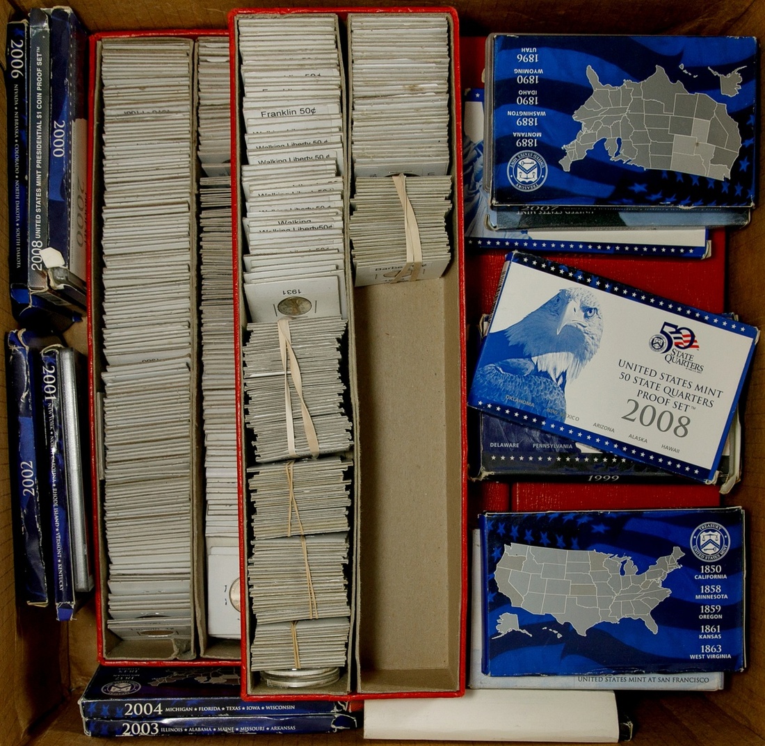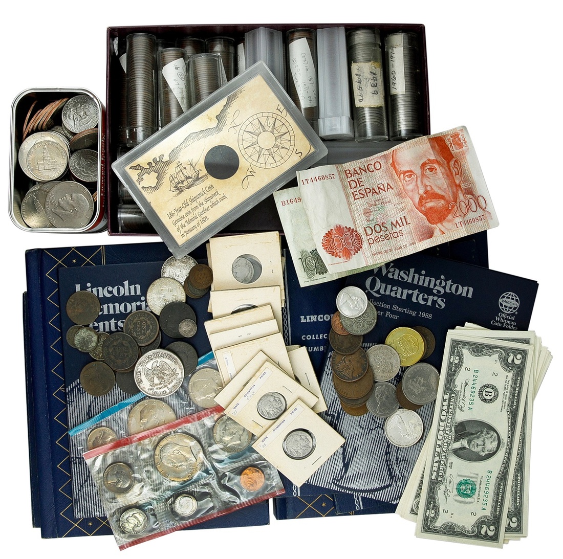 U.S. Hodgepodge. Includes: a low-grade Vermont Cent, a cleaned and re-engraved 1876-S Trade Dollar, a bent 1803 Cent VF details, other well-circulated large Cents (6), a few Indian Cents and worn type coins; 40% Kennedy Halves (2); Buffalo Nickels (25); Partial Jefferson Nickels 1938-1991 in Whitman albums, roll and near roll of Jeffersons; Lincoln Cents: 21 Rolls of Wheaties (a few only partial); 1909-1940 partial Whitman albums (2), 1941-1971 near complete albums (2), partial Memorial Cent album; partial Canadian small cent album; 1976 mint sets (2); Clad coinage - Kennedy Halves (49), Eisenhower Dollars (33), Susan B. Anthony (6), $6.10 in dimes and quarters; 1976 $2 Federal Reserve Notes (6), modern small size Dollars (21, a few star notes); also a small group of world coins -- a few silver including a Canadian 1958 Dollar and 1967 25 Cents, 50 Cents and Dollar; contemporary counterfeit British Trade Dollar, and a few world banknotes.