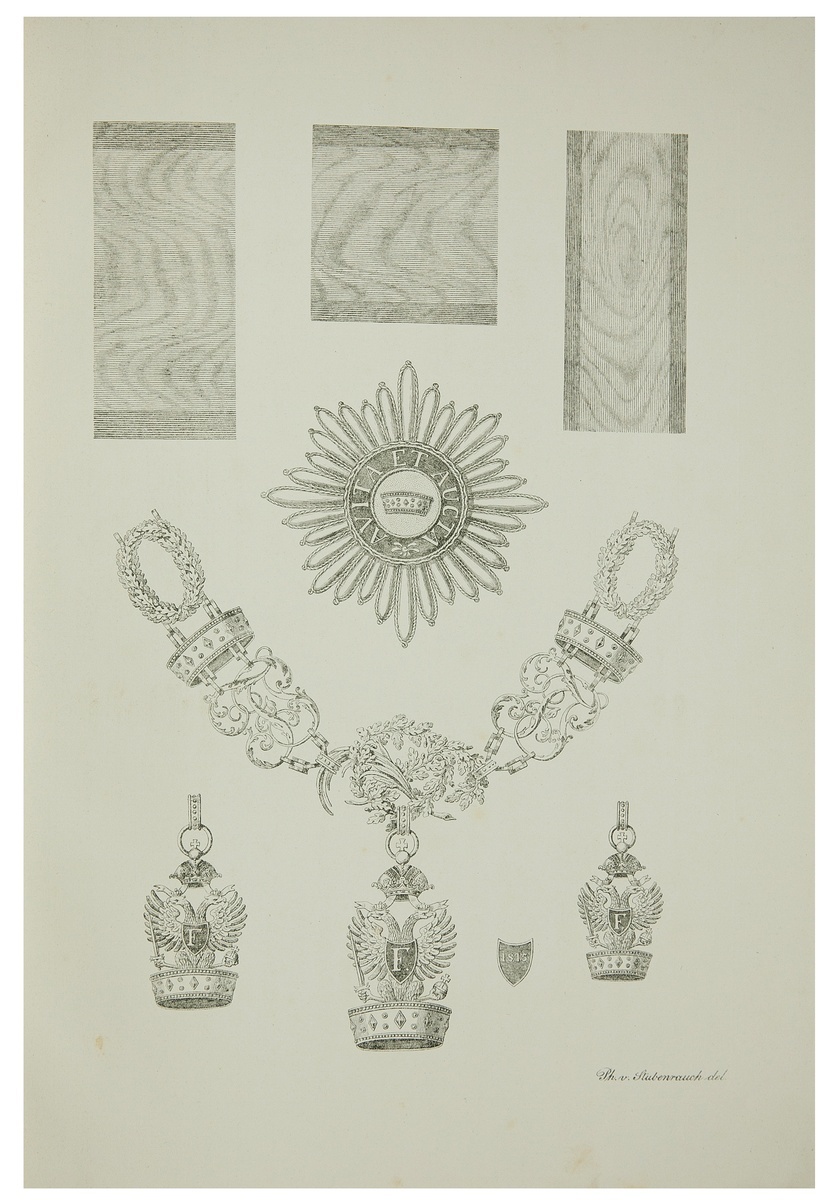 Austria. Statuten für den Oesterreichisch-Kaiserlichen-Orden der eisernen krone. 1884. Statutes for the Order of the Iron Crown. Large folio, with seven black and white plates and four supplements. Some foxing to some of the plates. Very Good.