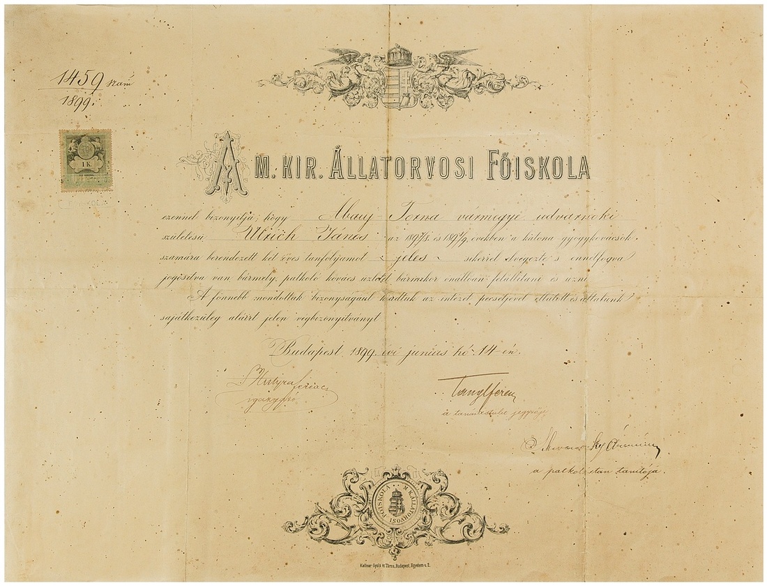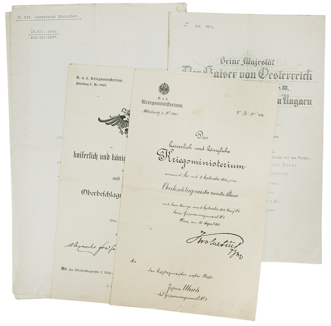 Austro-Hungary. Group of Award Documents to Johann Ulrich (Ulrich János). WWI. German language, Johann Ulrich, 2nd K.u.K. Hussars Regiment: Promotion to Oberbeschlagmeister (Senior Farrier) 2nd Class, War Ministry, 19 August 1913; promotion to Oberbeschlagmeister 1st Class, War Ministry, 30 April, 1916; Awarding of the Silver Cross of Merit with Crown, 12 May 1915; Civil, Hungarian language: Awarding of the Bronze Medal of Merit, Budapest 25 November 1927; 17 April, 1928; and Silver Cross of Merit, Budapest 17 October 1931. All Fine; also his 1899 Diploma from Veterinary School. Large folio, tape-backed. (7)