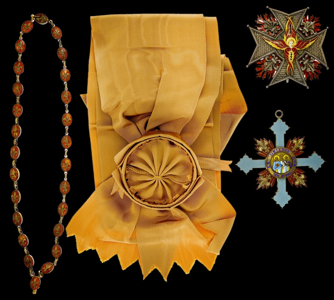 Bulgaria. Kingdom. Order of Saints Cyril and Methodius. A Fine Grand Cross Set. Badge. 82mm. Silver gilt and pale blue, blue and red enamels. Nimbate, enameled facing gold Saints, EX ORIENTE LUX in blue on gold around, on the back medallion, the royal cipher on red, XVIII - MAJUS MDCCCCIX in blue letters around. Pale blue enameled cross arms, gilt fleurs on red flames in angle. With gilt and red enameled chain - alternating fleurs and Bulgarian lions, 21". Breast Star. By C.F. Rothe, Vienna. 77mm. Silver, gold, and enamels. Chiseled and pierced red enameled wings and rays, Seraphim at center set on a silver cross plaque, silver fleurs on red enameled flames in angles. Vertical pinback. FR, greyhound and "A' marks on back; C.F. ROTHE, WIEN and double "A" marks on pin. With light brown Grand Cross sash. In original "bombe" style, purple-lined case. Small chip to bottom of Seraphim. Otherwise Extremely Fine. A rare and attractive set.