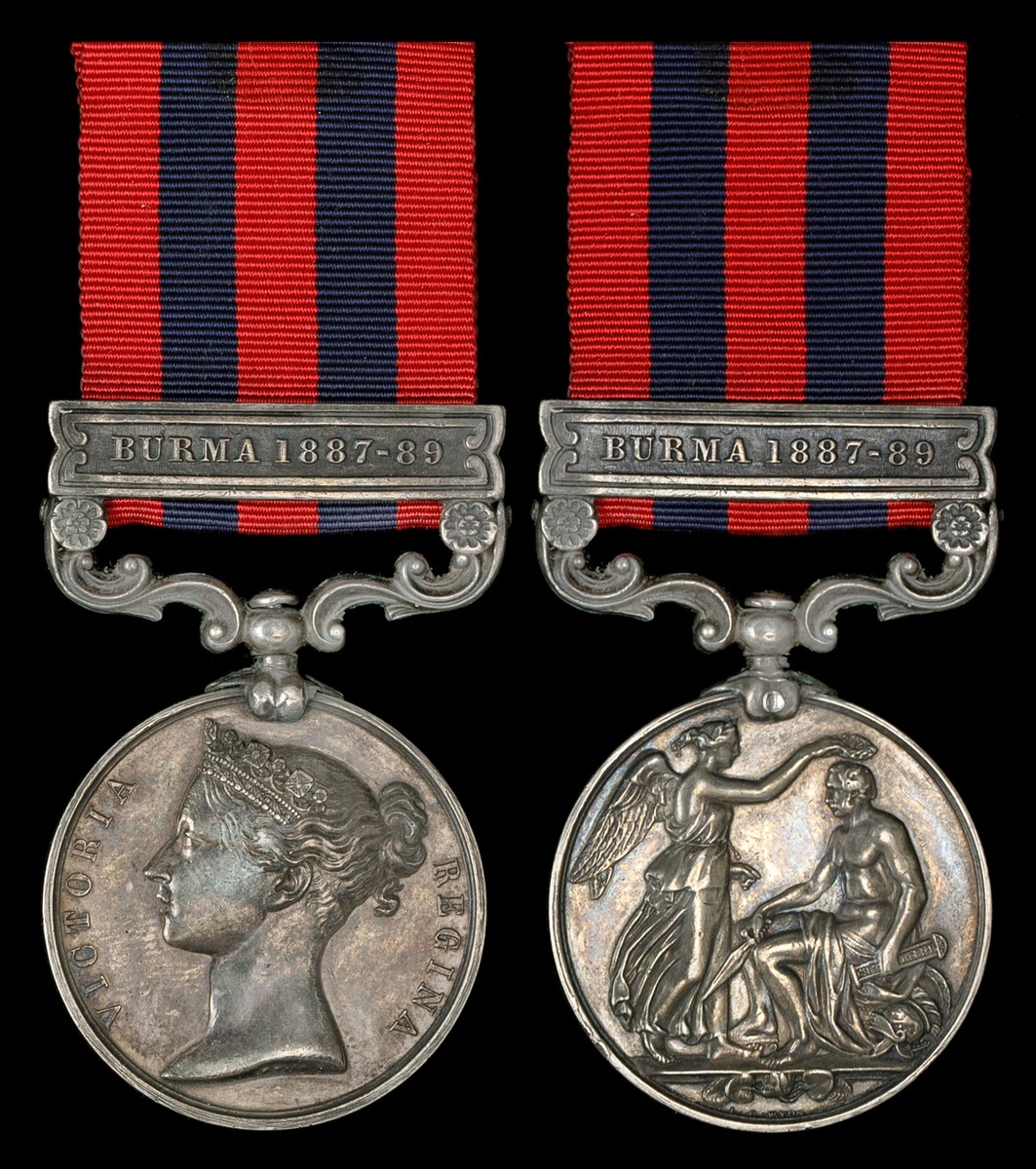 Great Britain. India General Service Medal, 1854-1895. One clasp: "Burma 1887-9" (1655 Pte. J. Linchan 2d Bn R. Muns. Fus.). Engraved. On ribbon. Toned deep charcoal gray. Extremely Fine.